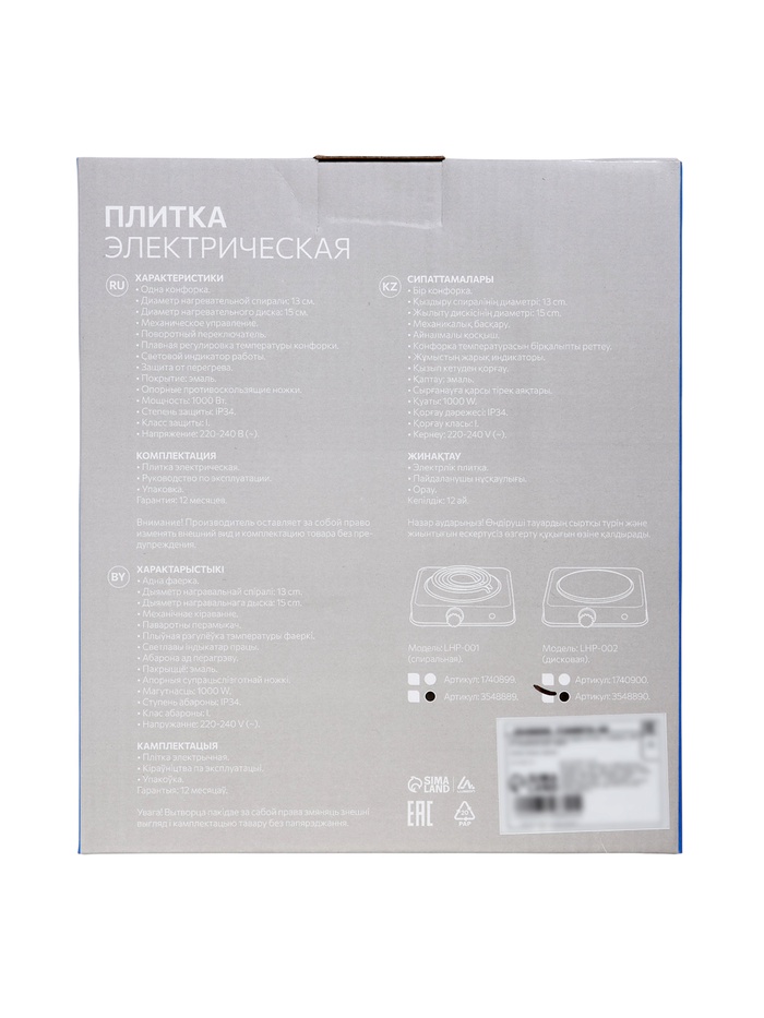 Плитка электрическая Luazon LHP-002, 1 конфорка, 1000 Вт, нагреватель диск, чёрная — Характеристики