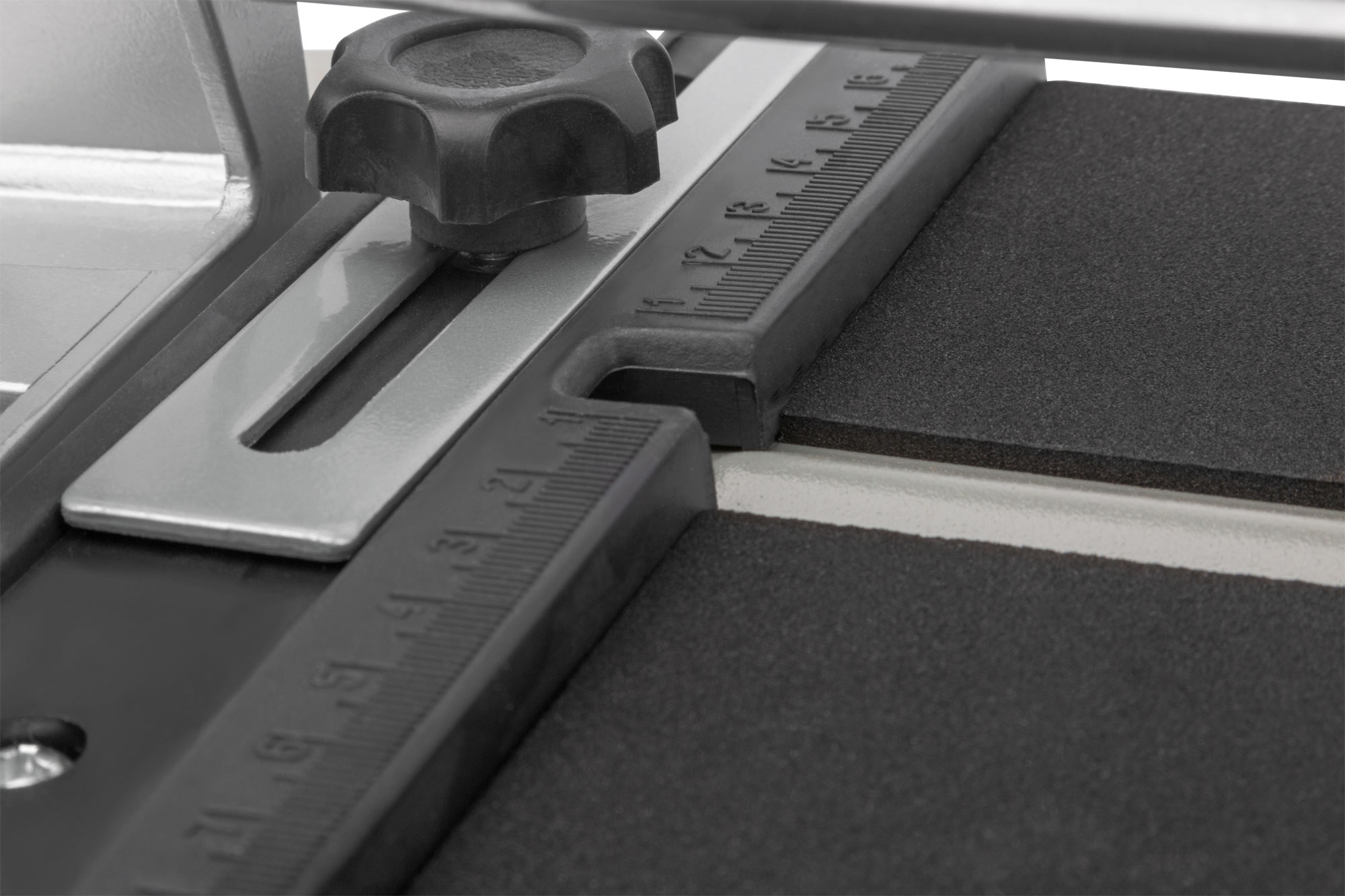 Инструмент выполнен из стали, алюминия и пластика, что обеспечивает долговечность и устойчивость к износу. Твердосплавный ролик диаметром 15 мм и толщиной 1,5 мм гарантирует точность и гладкость реза. Упаковка в картонной коробке защищает плиткорез от повреждений при транспортировке.
