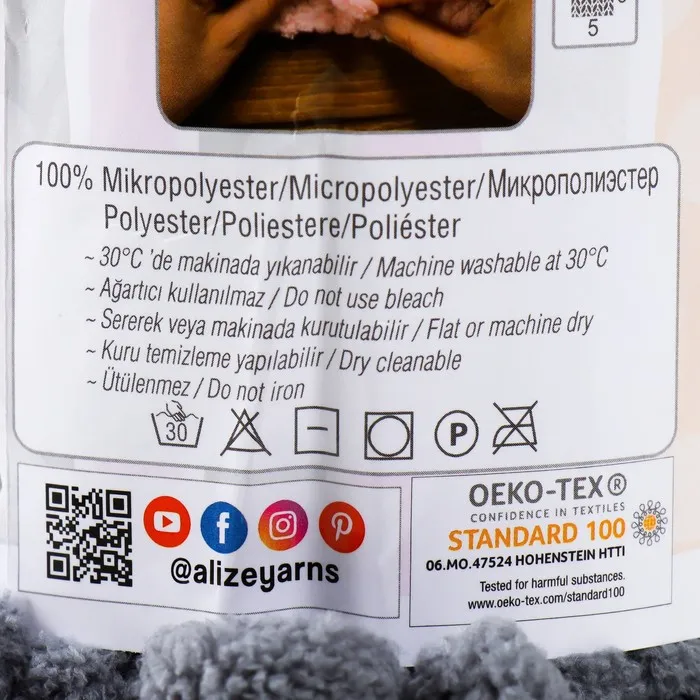 Плюшевая пряжа для вязания руками ALIZE, Puffy, 100 % микрополиэстер, 9 м/100 г, (87 св. угольный) — Характеристики