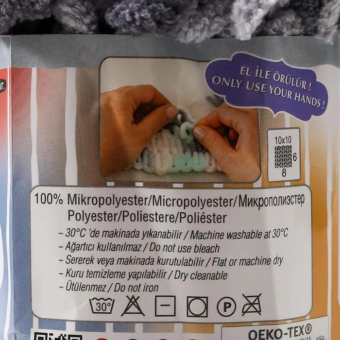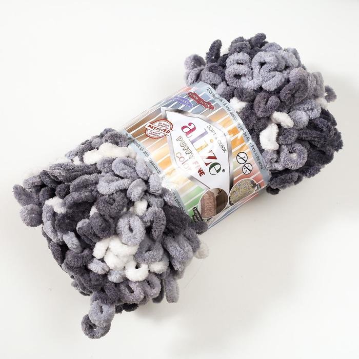 Плюшевая пряжа для вязания руками ALIZE, Puffy Fine Color, 100% микрополиэстер, 14.5 м/100 г, (5925 серый камуфляж) — Характеристики