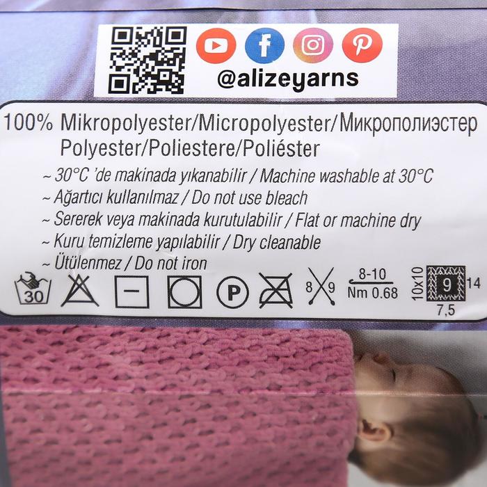 Плюшевая пряжа для вязания спицами, крючком ALIZE, Velluto, 100% микрополиэстер, 68 м/100 г, (62 молочный) — Характеристики