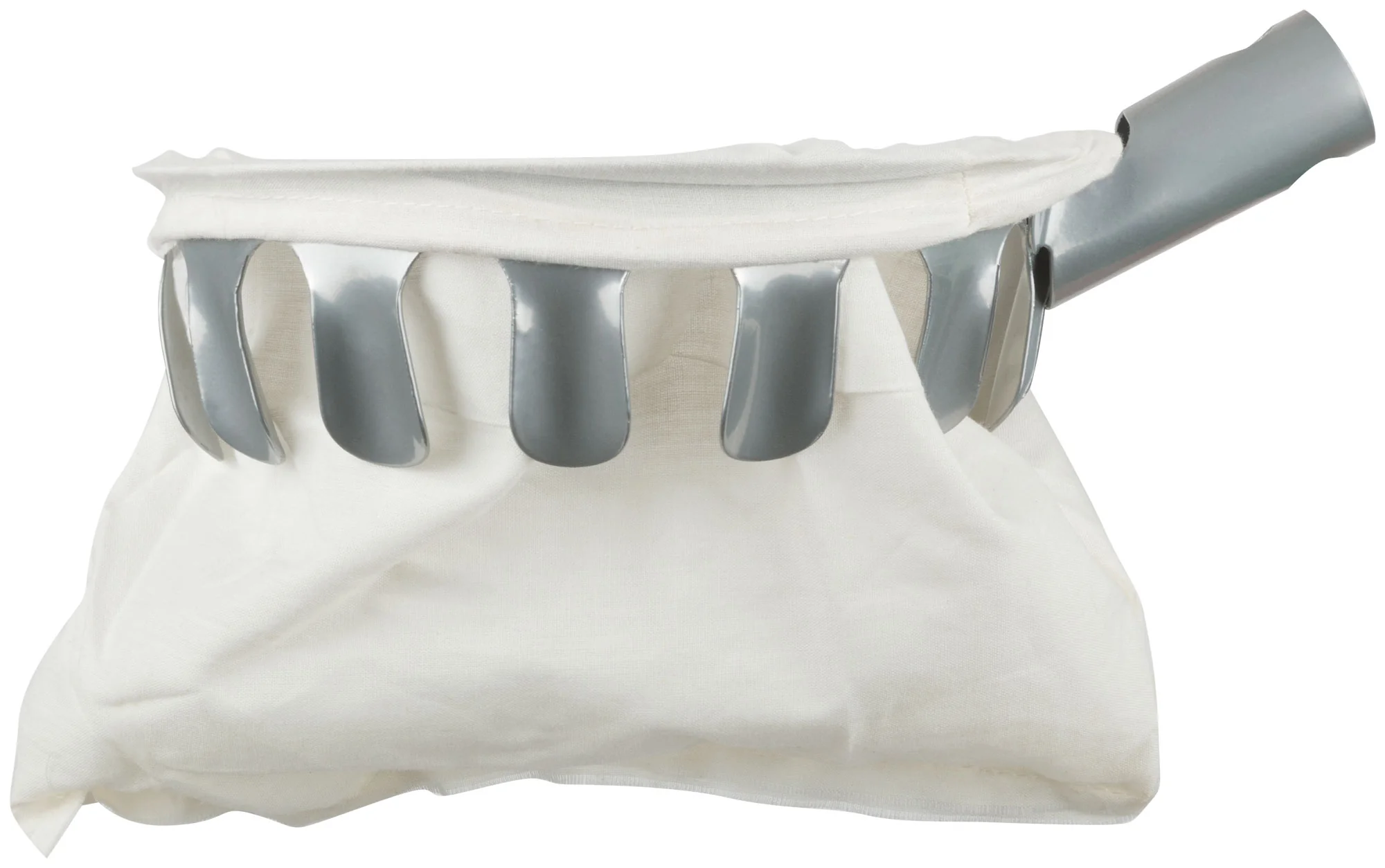 Конструкция плодосборника включает обод из инструментальной стали и мешок из хлопчатобумажной ткани, что обеспечивает надежность и долговечность. Благодаря легкому весу в 200 г, инструмент удобно использовать даже при длительных работах.