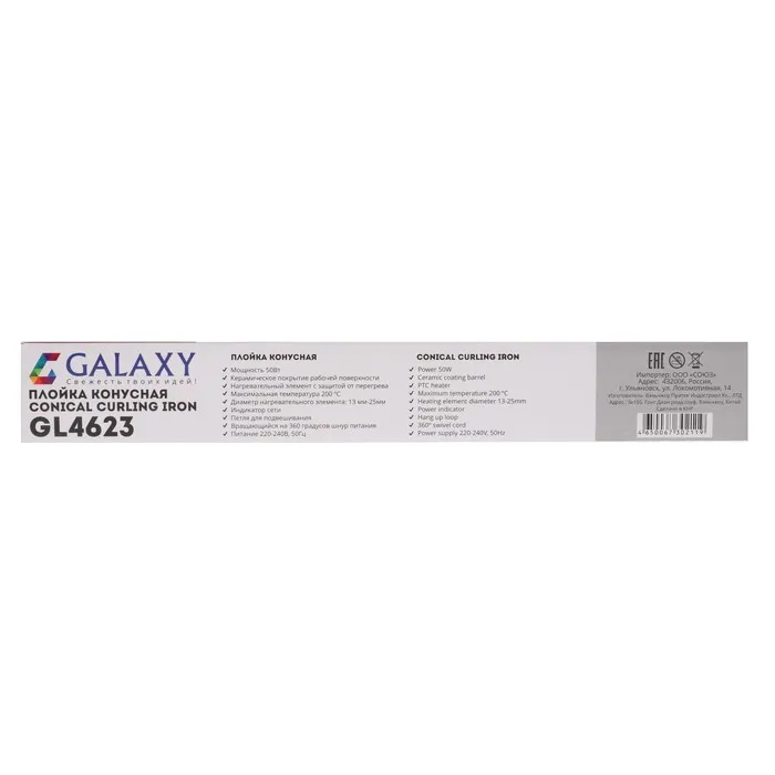 Плойка Galaxy GL 4623 поможет создать красивые естественные локоны любой длины. Керамическое покрытие рабочей поверхности убережёт структуру волос от негативного температурного воздействия. Конусная форма с оптимальным для завивки диаметром, безопасный изолированный наконечник и вращающийся шнур делают использование максимально комфортным.