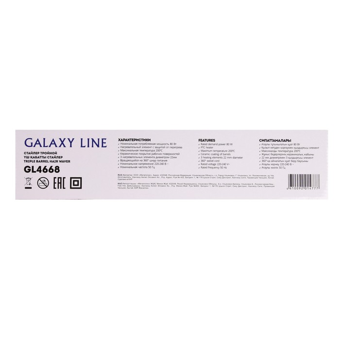 Плойка Galaxy GL 4668, 80 Вт, тройная, керамическое покрытие, d=16 мм, до 210 °C, чёрные — Характеристики