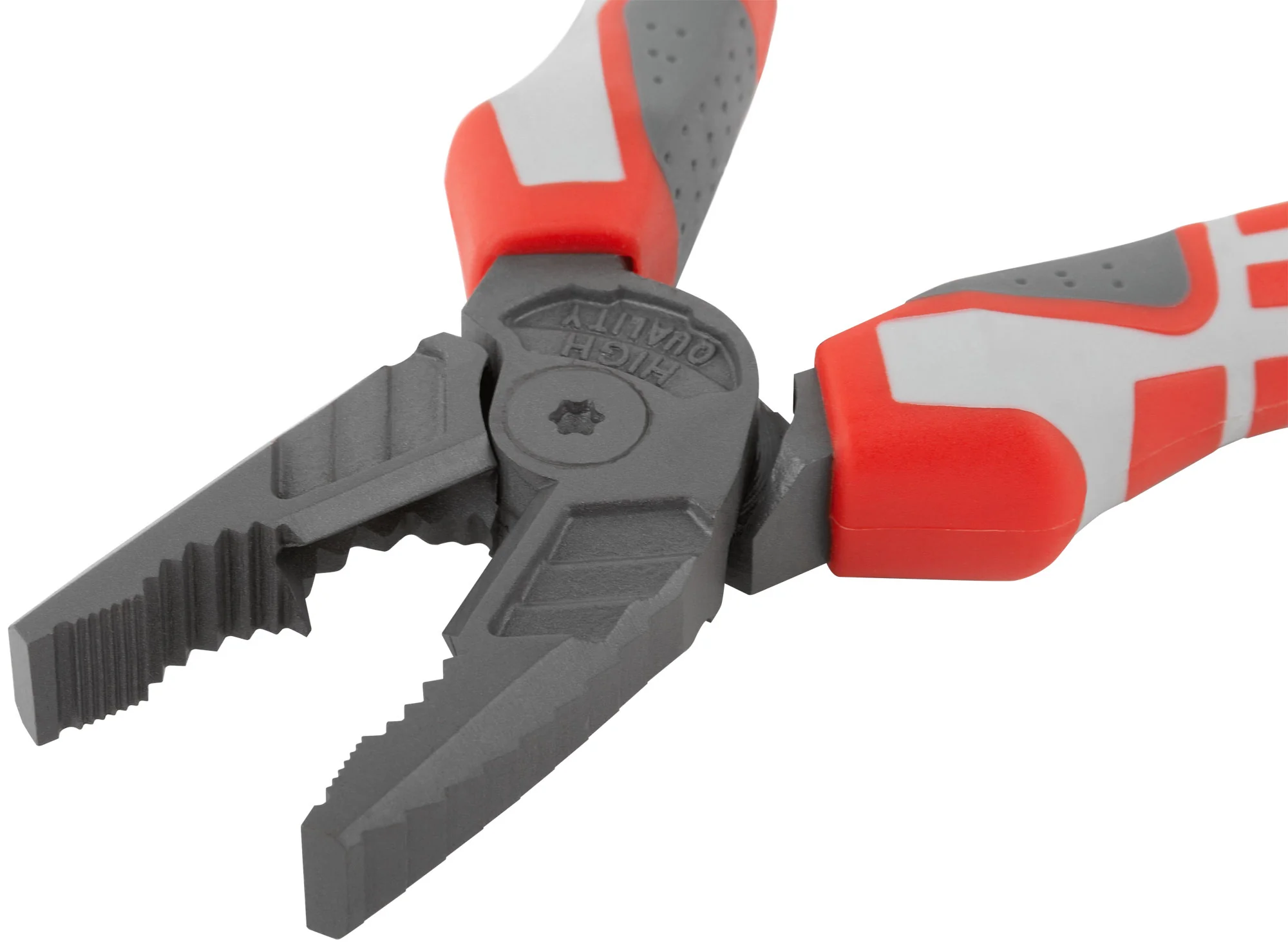 Конструкция плоскогубцев включает в себя хром-ванадиевую сталь с антикоррозийным тефлоновым покрытием, что гарантирует долговечность и защиту от ржавчины. Специальные ребра жесткости на губках усиливают конструкцию, делая ее более устойчивой к нагрузкам. Трехкомпонентные прорезиненные ручки обеспечивают удобный и надежный хват.