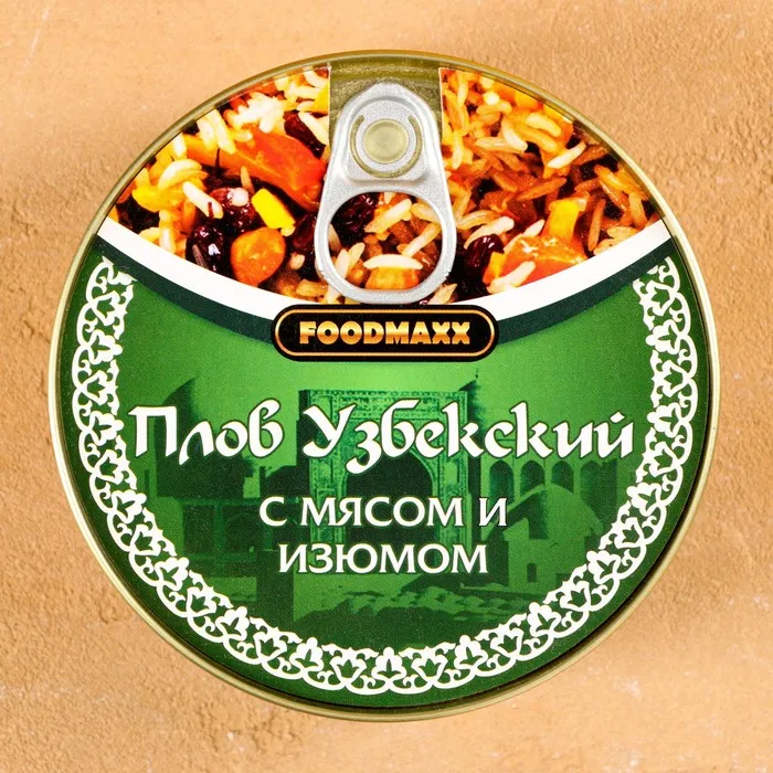 Каждая банка наполнена отборным рисом, нежным мясом и сладким изюмом, приправленным ароматными специями. Это сочетание создает насыщенный и гармоничный вкус, который порадует даже самых искушенных гурманов. Консервированный плов "Праздничный" сохраняет все питательные вещества и ароматы, позволяя вам наслаждаться настоящим узбекским блюдом без лишних хлопот.