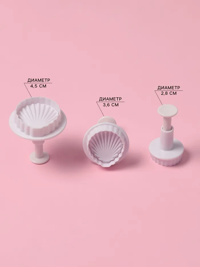 Плунжеры кондитерские Доляна «Морские ракушки», набор 3 шт., d=2.8/3.6/4.5 см, h=5 см, пластик, белые — Характеристики