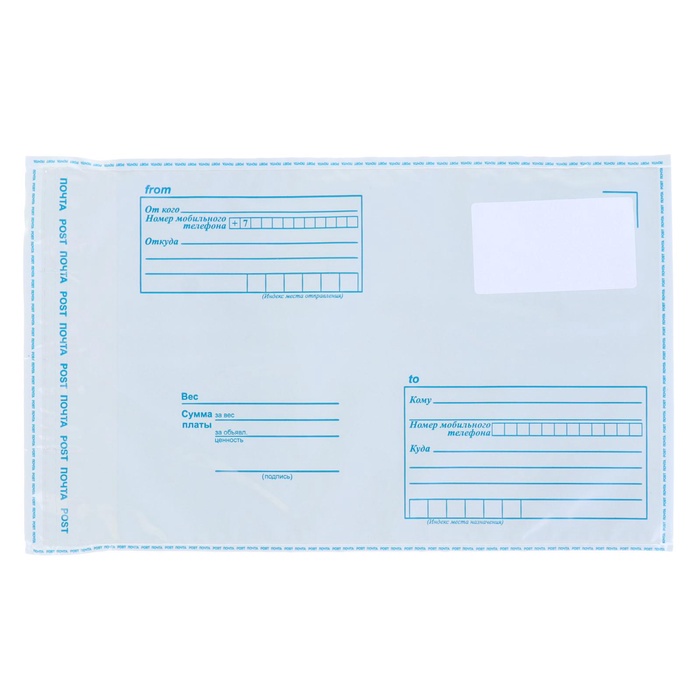 С почтовым пакетом Ваше почтовое отправление упакованное в пластиковый пакет никогда не промокнет и не испачкается. Это наиболее удобный способ аккуратно доставить Вашу посылку.