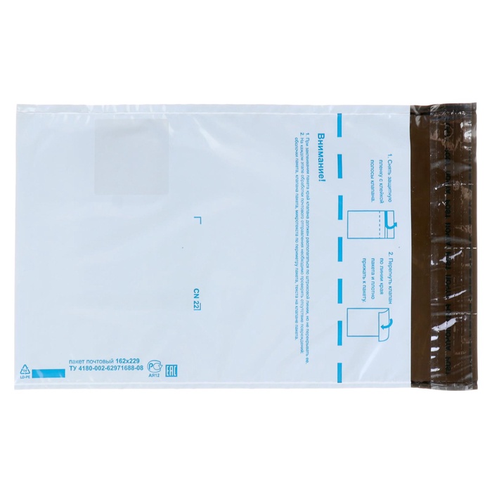 Пакет имеет размер 162х229 мм. Достаточно плотный и его содержимое не просматривается. Такой пакет особо прочен по сравнению с бумажными конвертами. Пластиковые пакеты соответствуют Техническим Условиям (ТУ) Почты России 2015 года и ПОУПС (Правилам оказания услуг Почтовой Связи) от 23 января 2015 год и принимаются во всех отделениях Почты России.