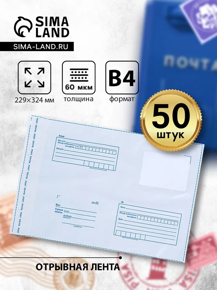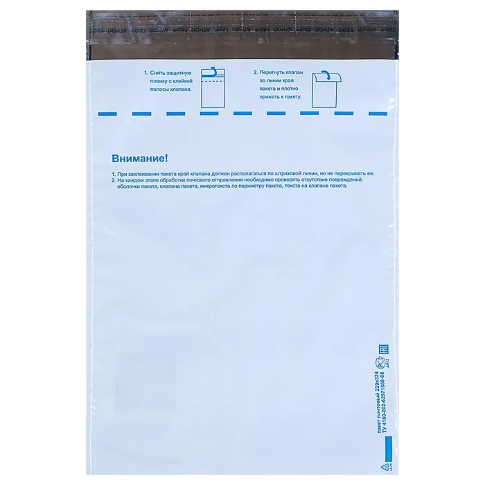 Почтовый пакет 229×324 мм, поле «Кому куда», отрывная лента, 60 мкм — Характеристики