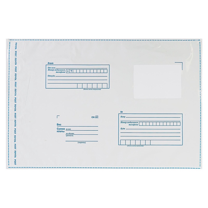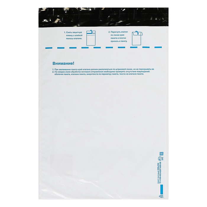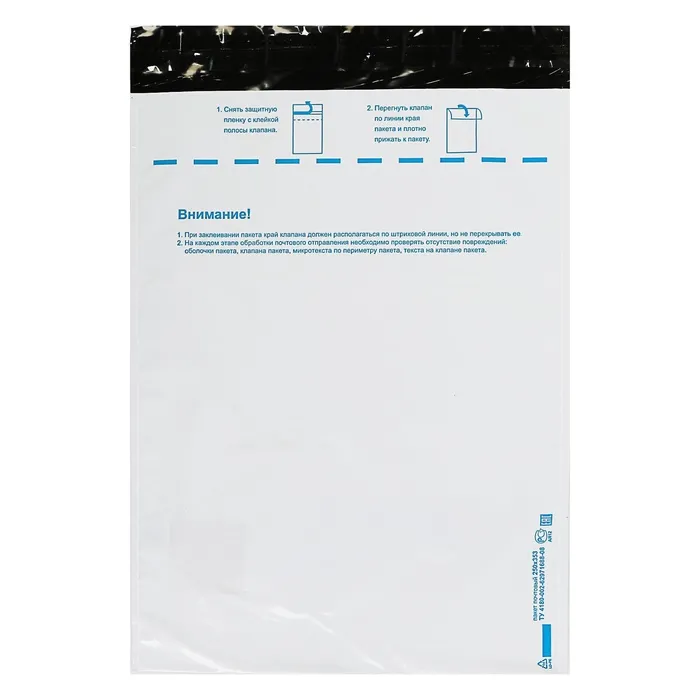 Пакет имеет размер 250х353 мм. Достаточно плотный и его содержимое не просматривается. Такой пакет особо прочен по сравнению с бумажными конвертами. Пластиковые пакеты соответствуют Техническим Условиям (ТУ) Почты России 2015 года и ПОУПС (Правилам оказания услуг Почтовой Связи) от 23 января 2015 год и принимаются во всех отделениях Почты России.