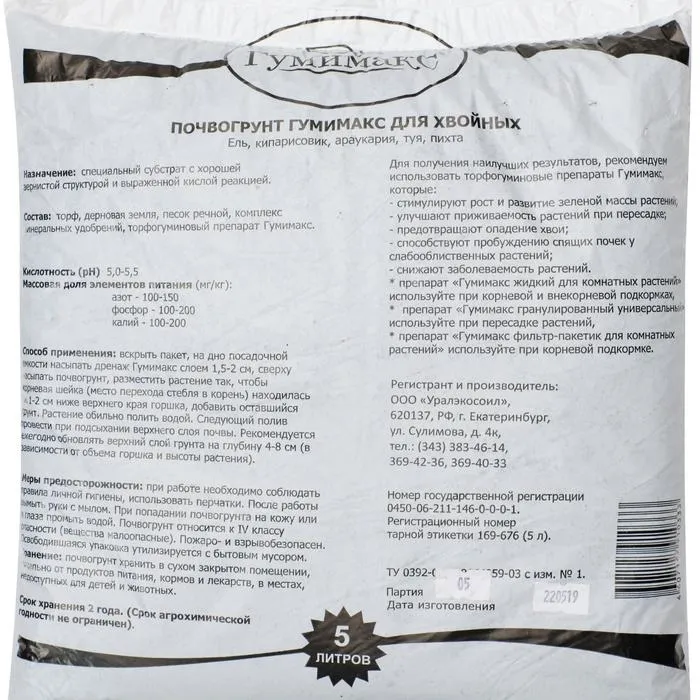 Готовый к использованию специальный субстрат для выращивания всех видов хвойных растений. Имеет зернистую структуру и выраженную кислотную среду (pH 5,0-5,5). Подходит как для открытого, так и для защищенного грунта.
