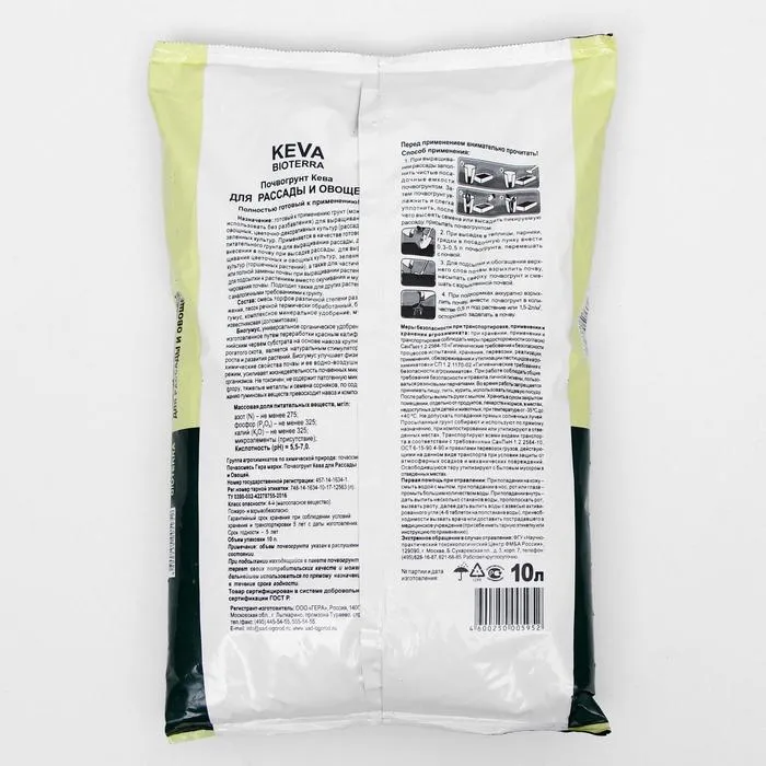 Назначение: готовый к применению грунт (можно использовать без разбавления) для выращивания рассады овощных и цветочно-декоративных культур, а также взрослых растений овощных, зеленных и других культур с аналогичными требованиями к грунту в открытом и защищенном грунте.
