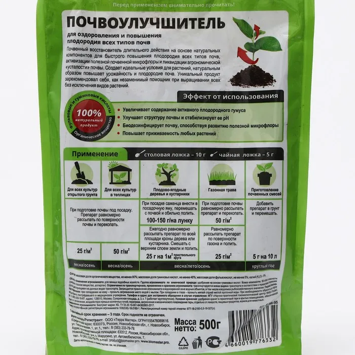 Почвенный восстановитель длительного действия на основе натуральных компонентов для быстрого повышения плодородия всех типов почв, активизации полезной почвенной микрофлоры и ликвидации агрономической «усталости» почвы. Создает идеальные условия для растений, натуральным образом повышает урожайность и плодородие почв. Уникальный продукт зарекомендовал себя, как незаменимый помощник при выращивании всех без исключения видов растений.
