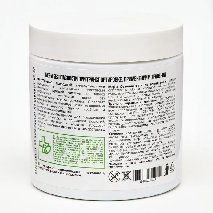 Гранулы-profi Биозащита - это инновационный, экологически чистый, пористый, влагоемкий, стерильный субстратный компонент на основе природного цеолита вулканического происхождения, имеющий сбалансированный природный состав макро- и микроэлементов, а также дополнительно обогащен спорами грибов Metarhizium anisopliae subsp.atis, Beauveria bassiana subsp.vivus.