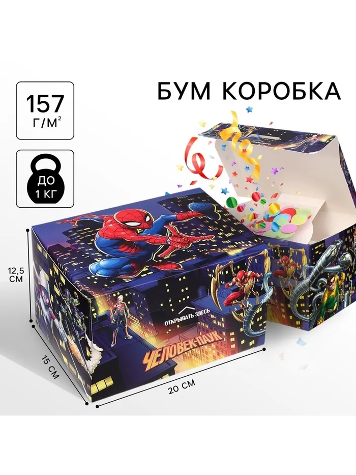 Подарочная коробка-бум, складная, 20х15х12.5 см, Человек-паук — Характеристики