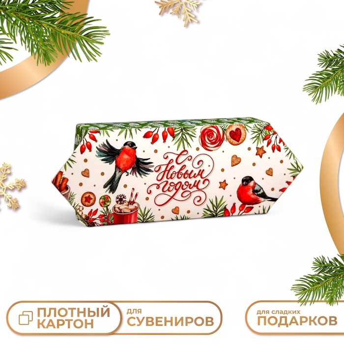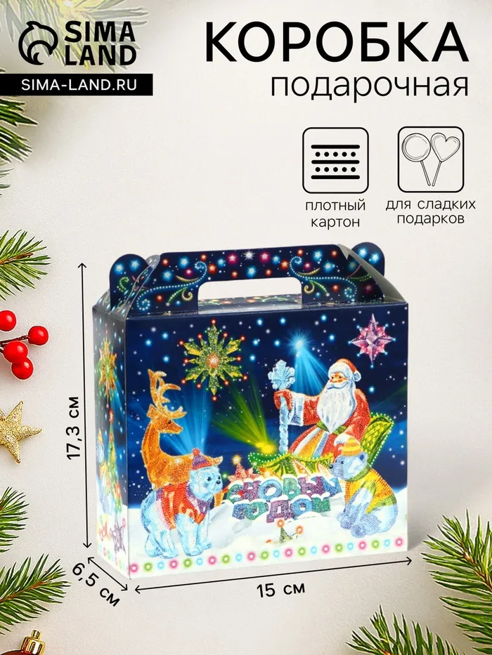 Коробка выполнена из качественных материалов, которые обеспечивают сохранность содержимого. Она имеет яркий и красочный дизайн, который отражает атмосферу Нового года.