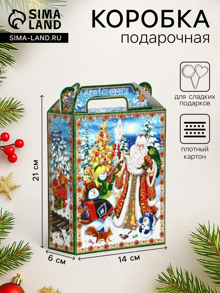 - Компактный вертикальный формат: Размеры 14×6×21 см удобны для шоколадных плиток, наборов конфет или небольших сувениров. Узкая форма экономит пространство под ёлкой.