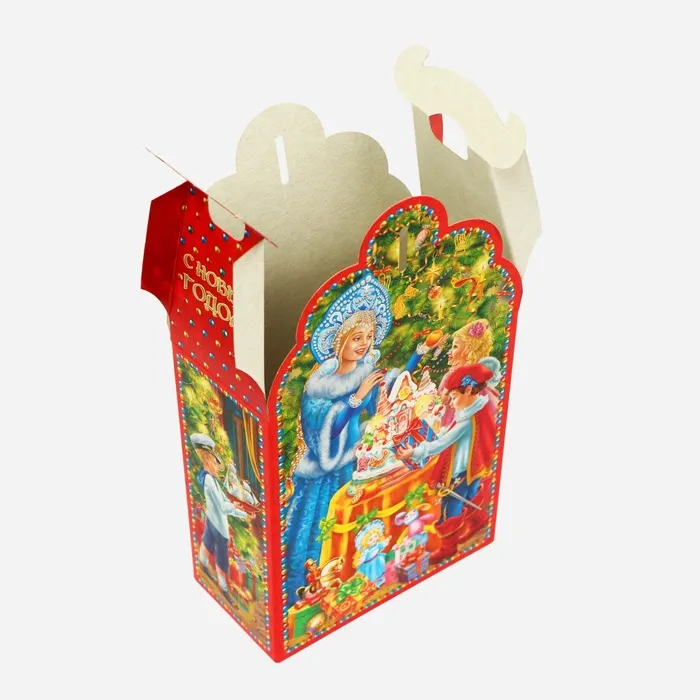 Коробка выполнена из качественных материалов, которые обеспечивают сохранность содержимого. Она имеет яркий и красочный дизайн, который отражает атмосферу Нового года.