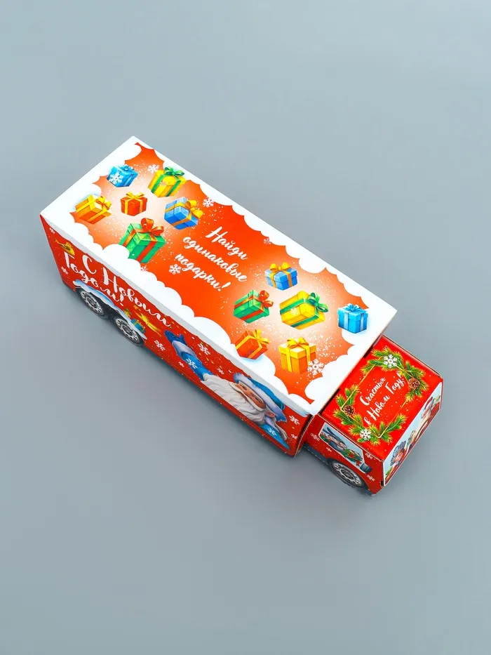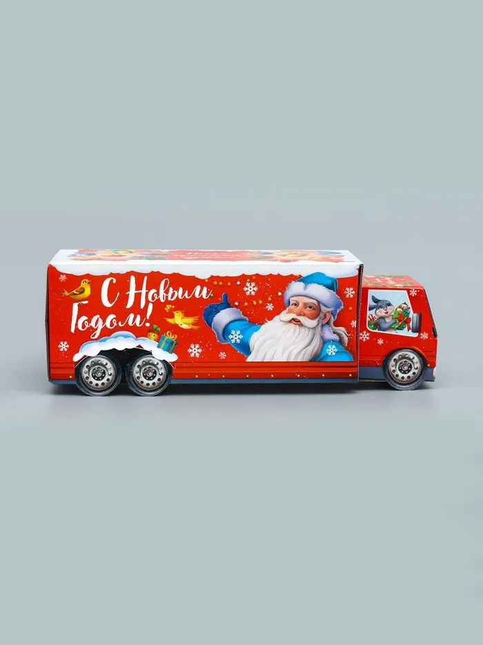 - Необычная форма: Коробка в виде грузовика с анимационными элементами выглядит динамично и современно. Такую упаковку приятно дарить и интересно распаковывать.