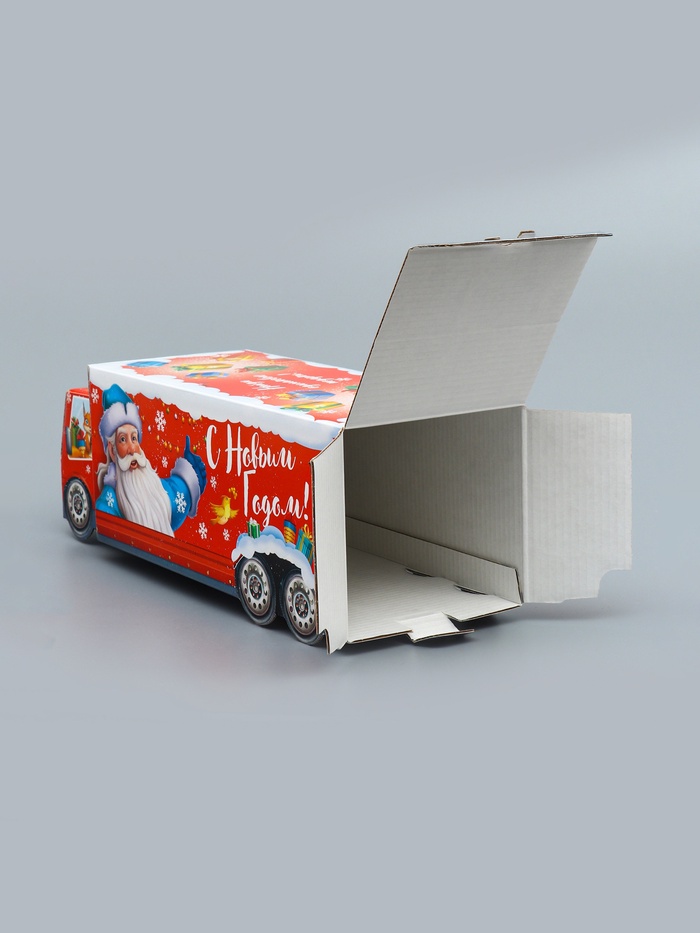 Новогоднее настроение в каждой детали! Фигурная коробка «Везу радость» с анимацией — яркий акцент праздничного упаковывания. Большая красная коробка в форме грузовика создает ощущение движения и веселья, превращая даже небольшой подарок в запоминающийся сюрприз.