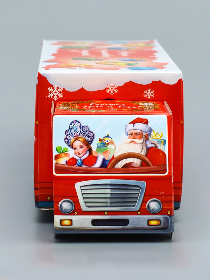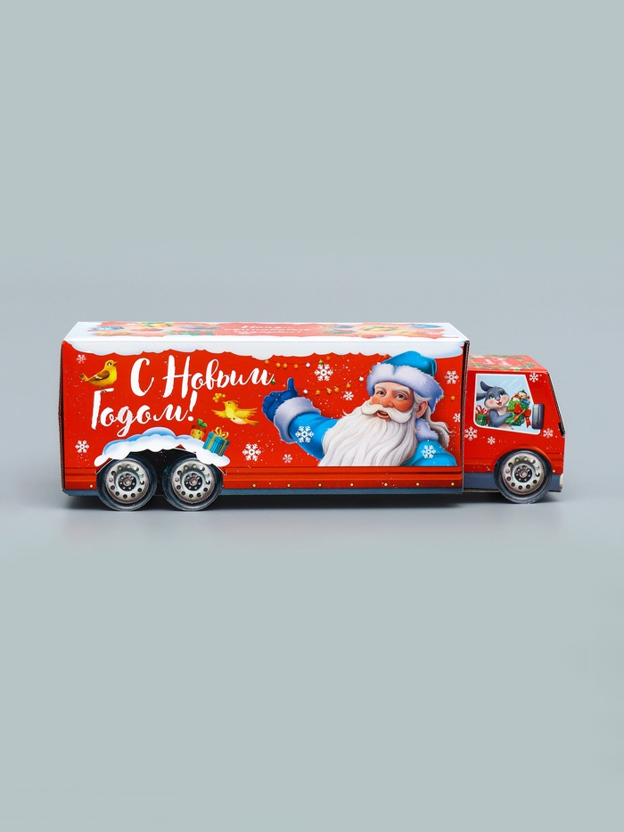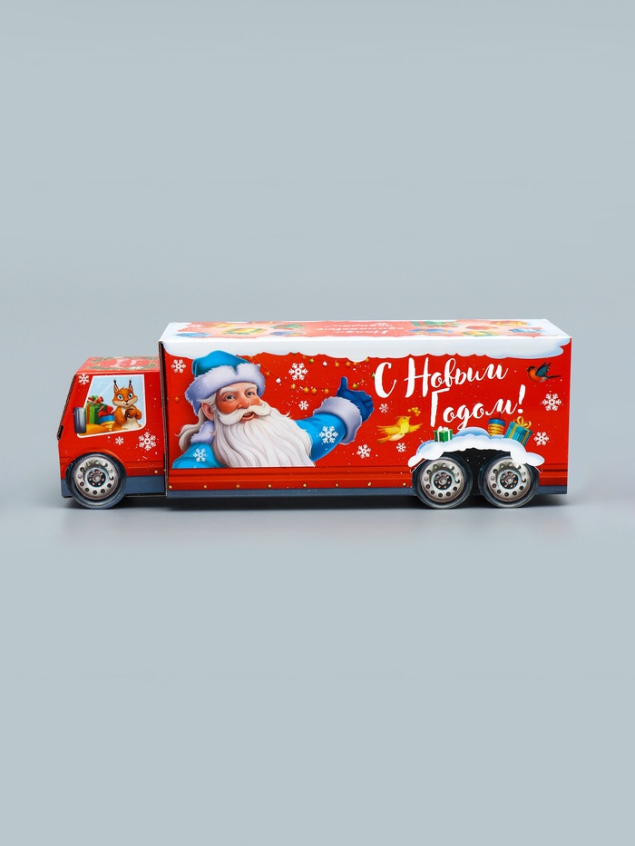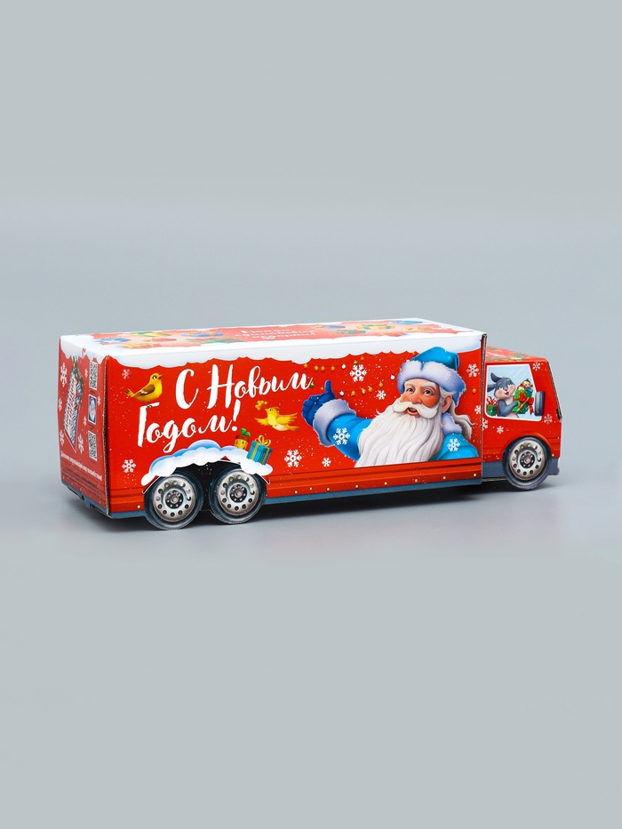 Новогоднее настроение в каждой детали! Фигурная коробка «Везу радость» с анимацией — яркий акцент праздничного упаковывания. Большая красная коробка в форме грузовика создает ощущение движения и веселья, превращая даже небольшой подарок в запоминающийся сюрприз.