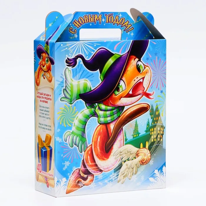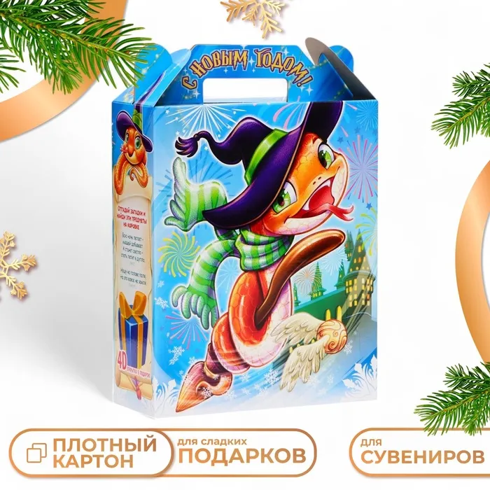 Коробка выполнена из качественных материалов, которые обеспечивают сохранность содержимого. Она имеет яркий и красочный дизайн, который отражает атмосферу Нового года.