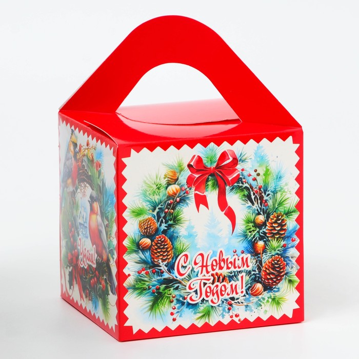 Подарочная коробка Новогодняя Кубик большой «Еловый Венок» 12×12×12 см — Характеристики