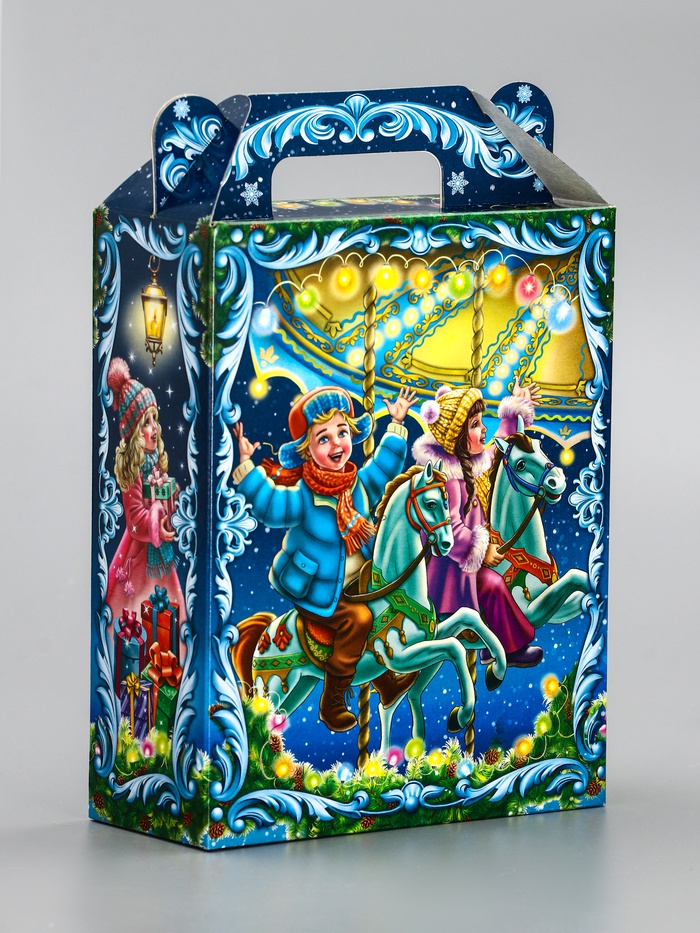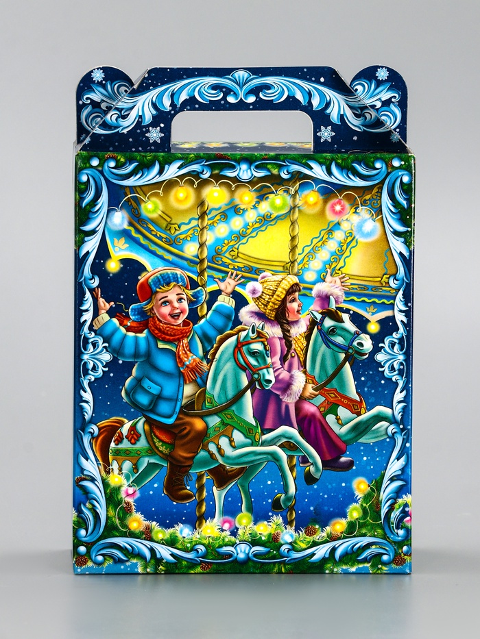 Для праздничного настроения: Яркое оформление с карусельными мотивами создаёт ощущение веселья и движения. «Новогодняя карусель» — решение для тех, кто ищет компактную и запоминающуюся упаковку для сладких подарков.