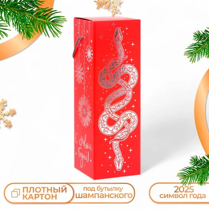 Подарочная коробка Новогодняя, под шампанское «Змея на красном Символ года» с веревоч. ручкой 11×11×35 см — Характеристики