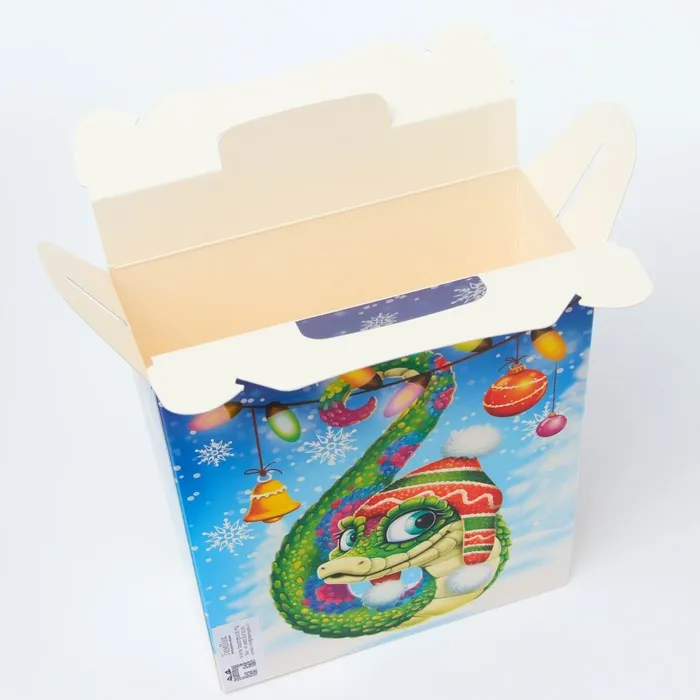 Коробка выполнена из качественных материалов, которые обеспечивают сохранность содержимого. Она имеет яркий и красочный дизайн, который отражает атмосферу Нового года.