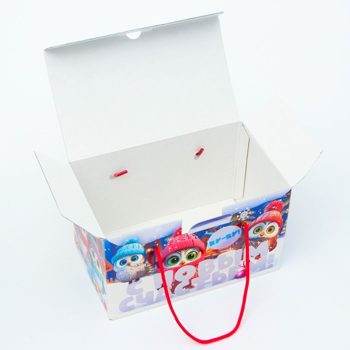 Подарочная коробка Новогодняя Посылка «Совята» с веревочными ручками с анимацией 20×12 см