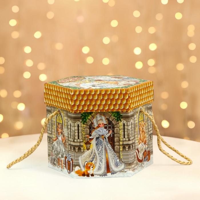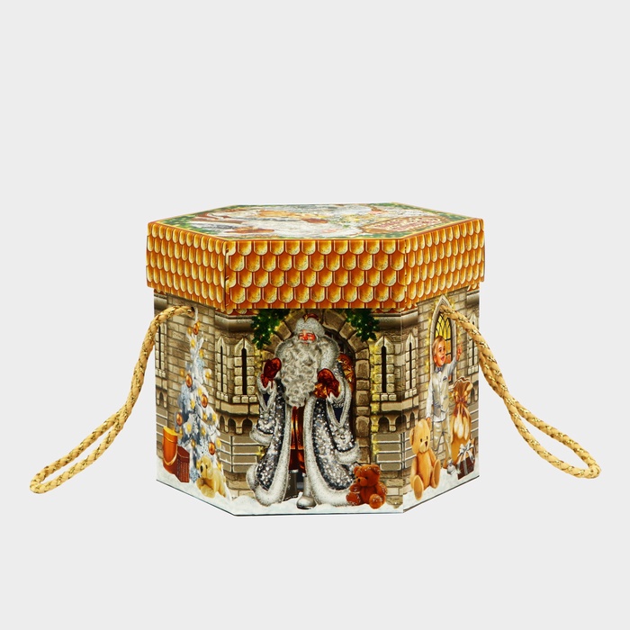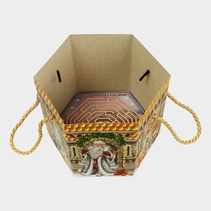 Подарочная коробка новогодняя Шестигранник малый "Новогодний шарм" с веревочными ручками, 210x210x185 мм.