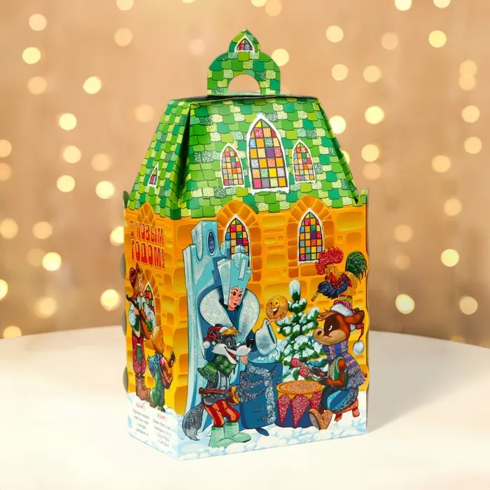 Коробка выполнена из качественных материалов, которые обеспечивают сохранность содержимого. Она имеет яркий и красочный дизайн, который отражает атмосферу Нового года.