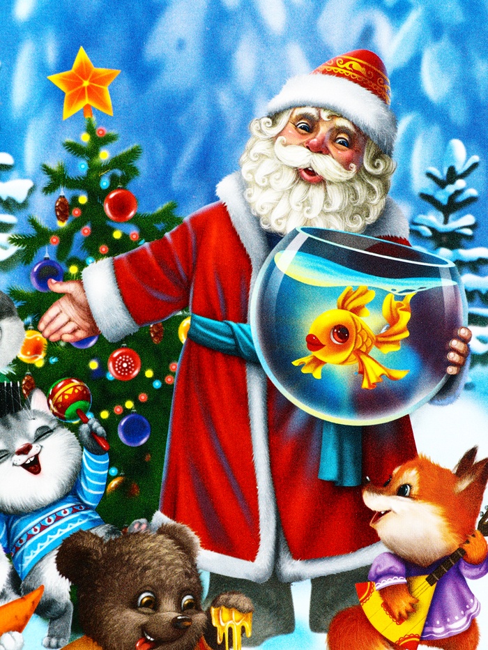 - Сказочная тематика: Изображение золотой рыбки на фоне снежных узоров напоминает о новогодних чудесах. Классическое сочетание голубого и красного соответствует праздничной палитре.
