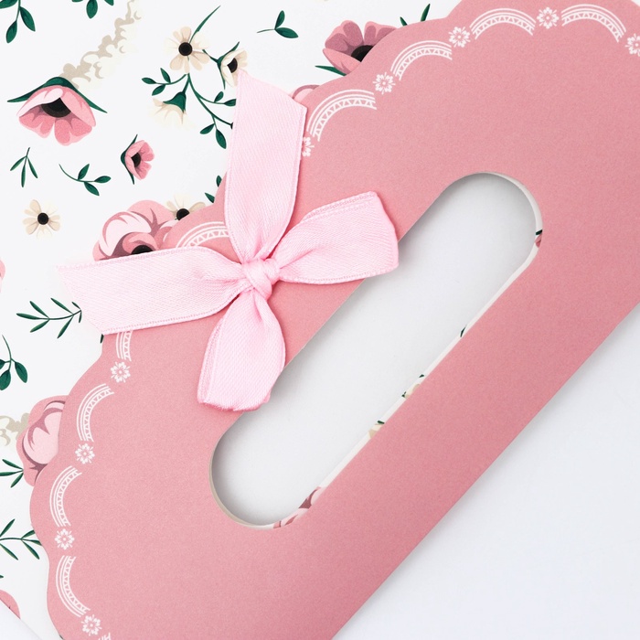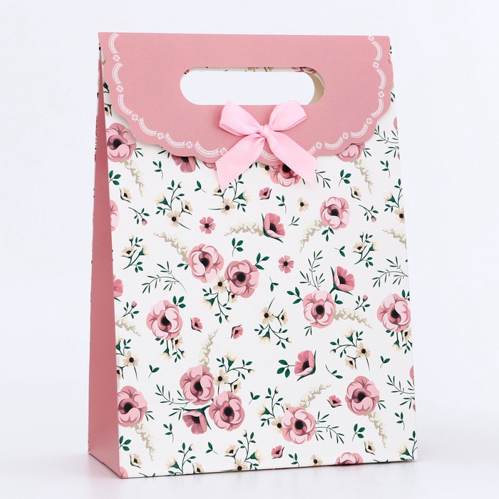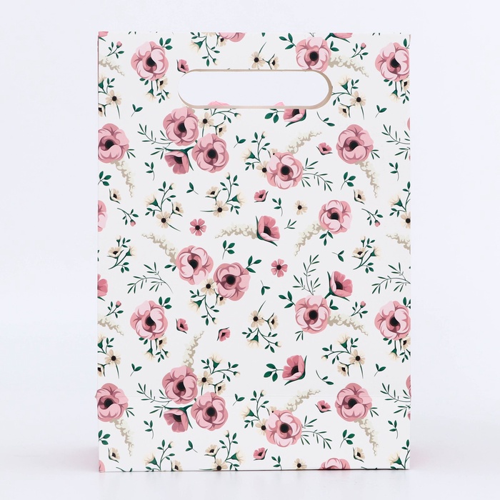 Подарочная коробка - пакет, упаковка с вырубной ручкой, «Розовые цветочки» , 19×9×27 см — Характеристики