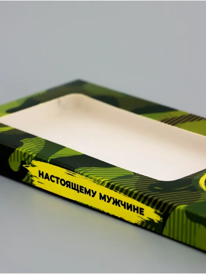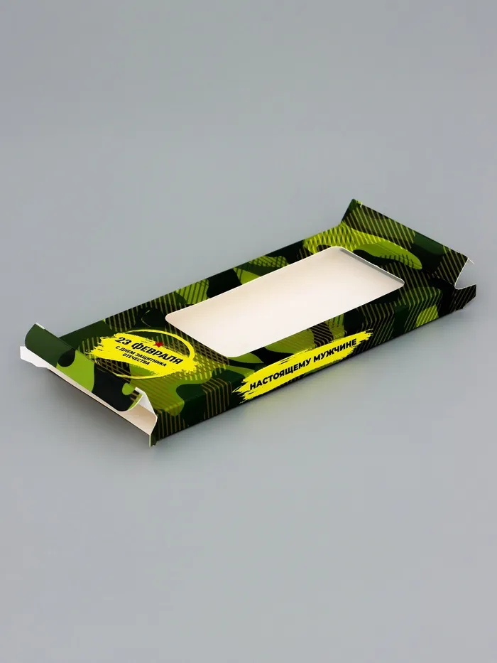 Подарочная коробка для шоколада с прозрачным окном — идеальный вариант для презента на 23 Февраля. Её лаконичный дизайн в зелёных тонах подчеркнёт стиль и мужественность получателя. Коробка станет достойным обрамлением для плитки шоколада, превратив простой подарок в запоминающийся жест внимания.
