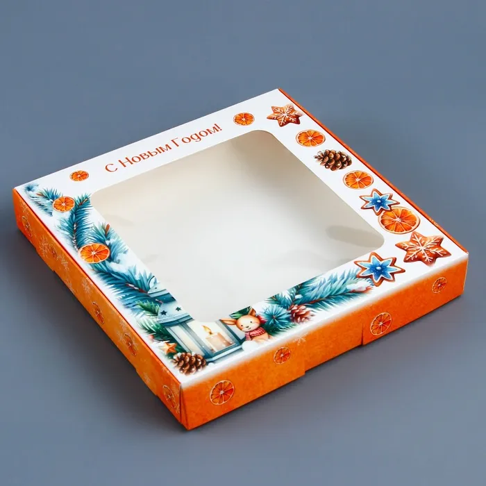 Подарочная сборная коробка с окном в новогоднем дизайне — это идеальная упаковка для кондитерских изделий, подарков и сувениров в праздничный сезон. Размеры и конструкция коробки позволяют удобно разместить различные виды сладостей, мелкие подарки или уникальные сувениры, обеспечивая их надежную защиту и привлекательное представление.
