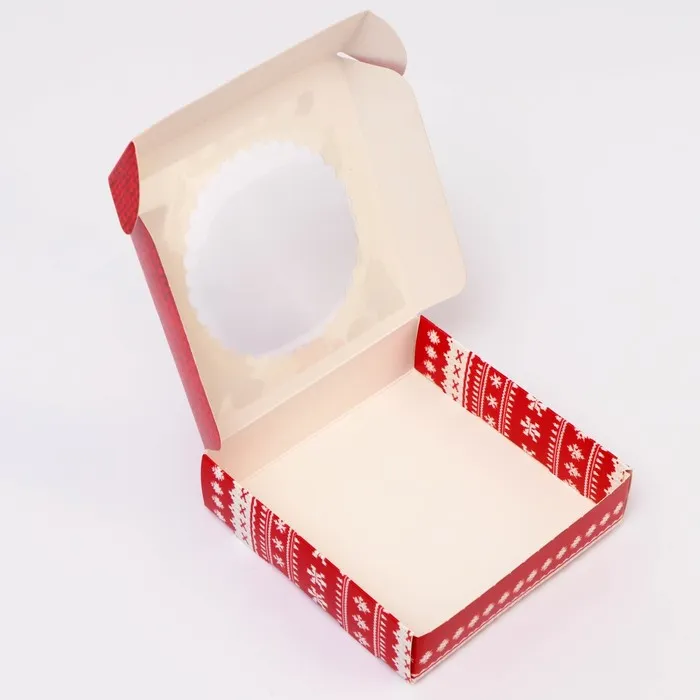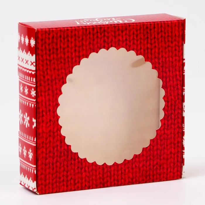 Коробка изготовлена из прочного картона, а прозрачное окно на крышке позволяет эффектно продемонстрировать содержимое, сохраняя его свежесть и целостность. Яркий новогодний дизайн, включающий снежинки, елочные украшения и рождественские элементы, создаёт атмосферу праздника и волшебства.