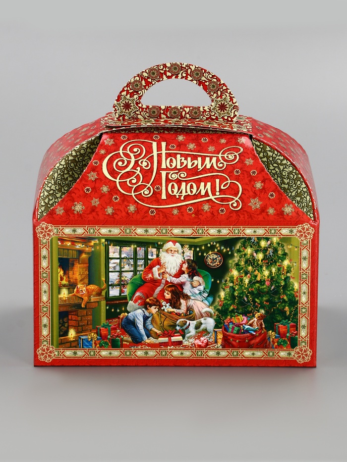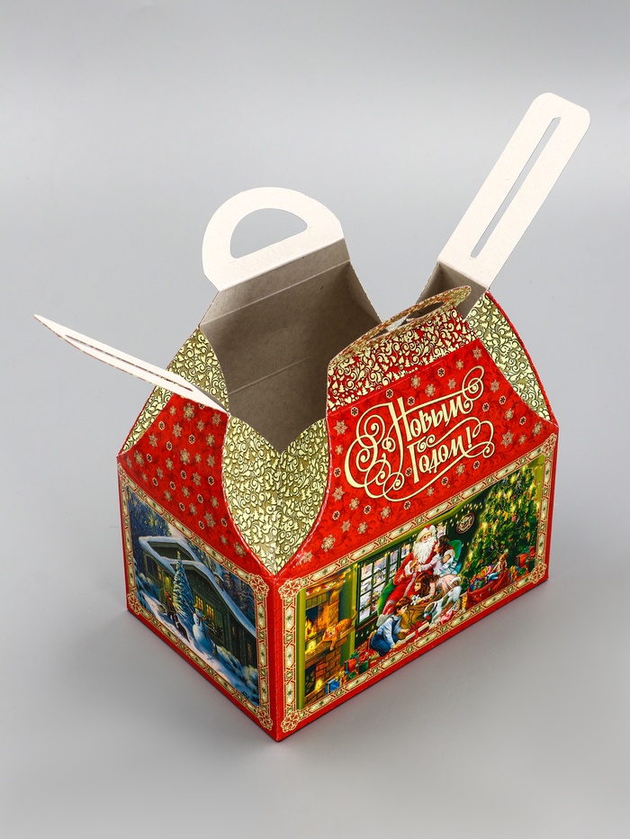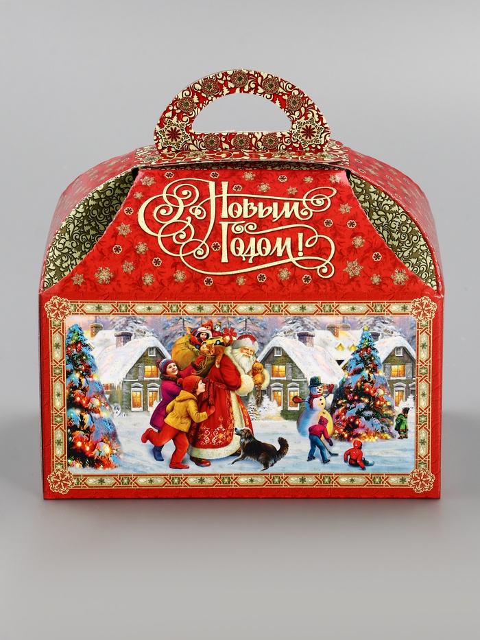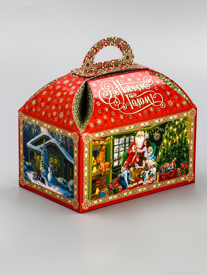 - Классическое цветовое решение: Насыщенный красный цвет и тематический новогодний декор создают традиционную праздничную атмосферу. Отсутствие символики года делает упаковку актуальной каждый сезон.