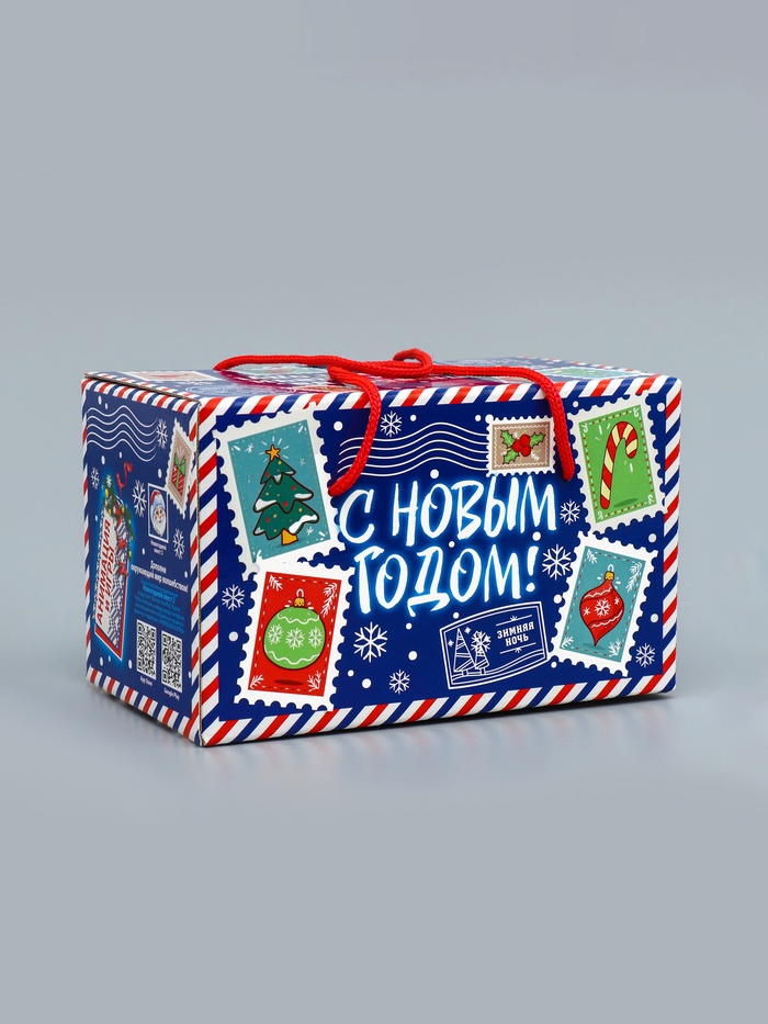 - Тематический дизайн: Морозные узоры, праздничные надписи и насыщенный синий цвет создают новогоднее настроение. Коробка выглядит как настоящая праздничная посылка.