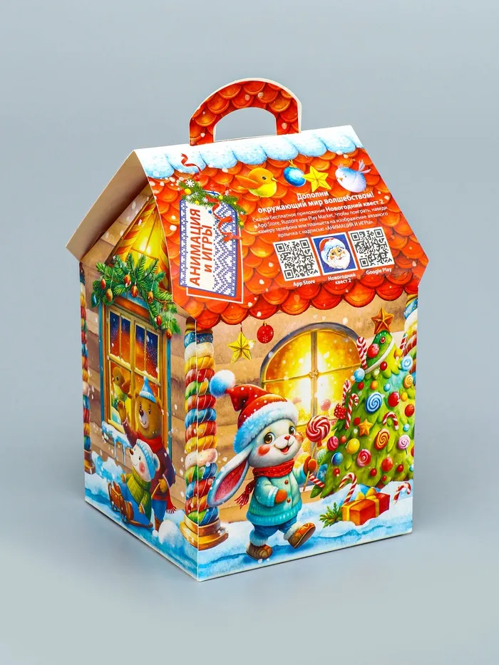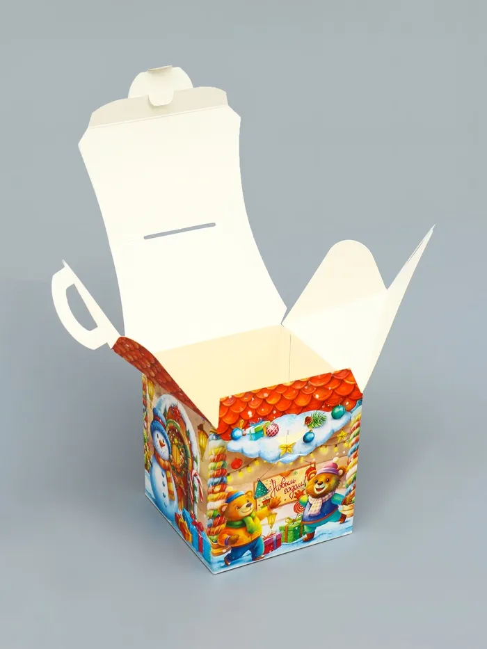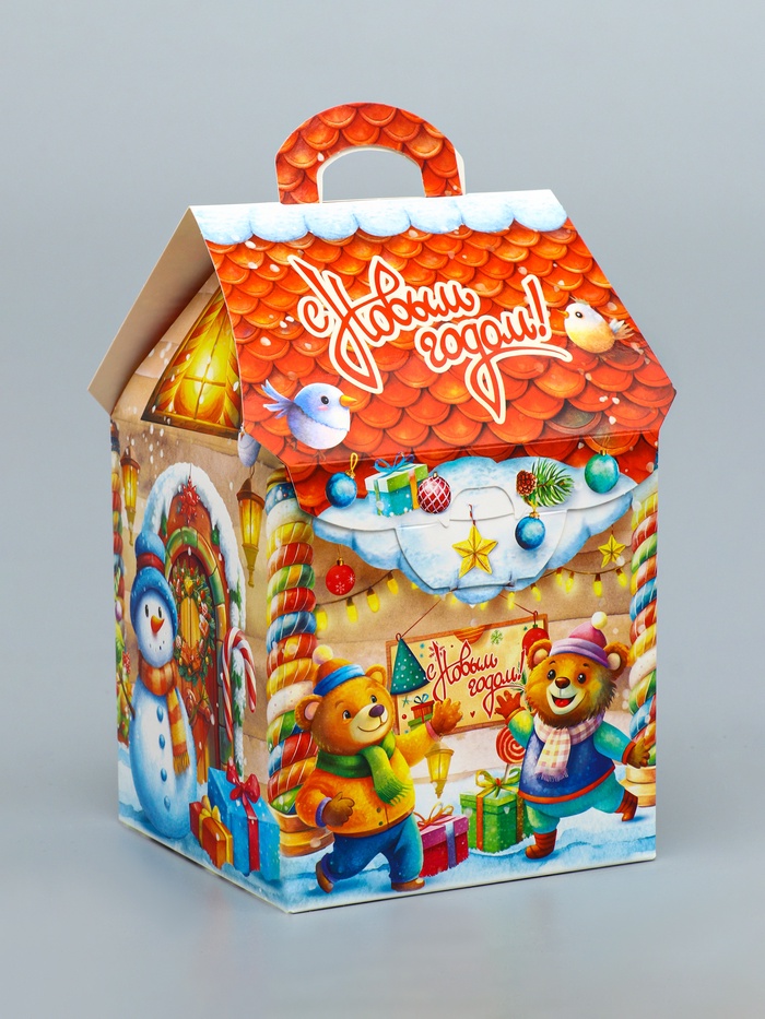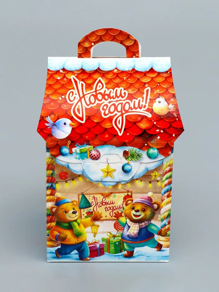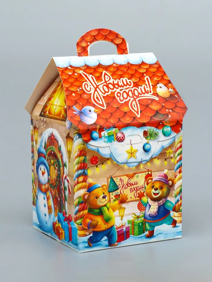 Готовое праздничное решение: Качественная печать сохраняет сочность красок, прочный материал защищает содержимое. Достаточно положить внутрь сладкий сюрприз — и оригинальный новогодний подарок готов. Такой домик станет милым дополнением к любому празднику.