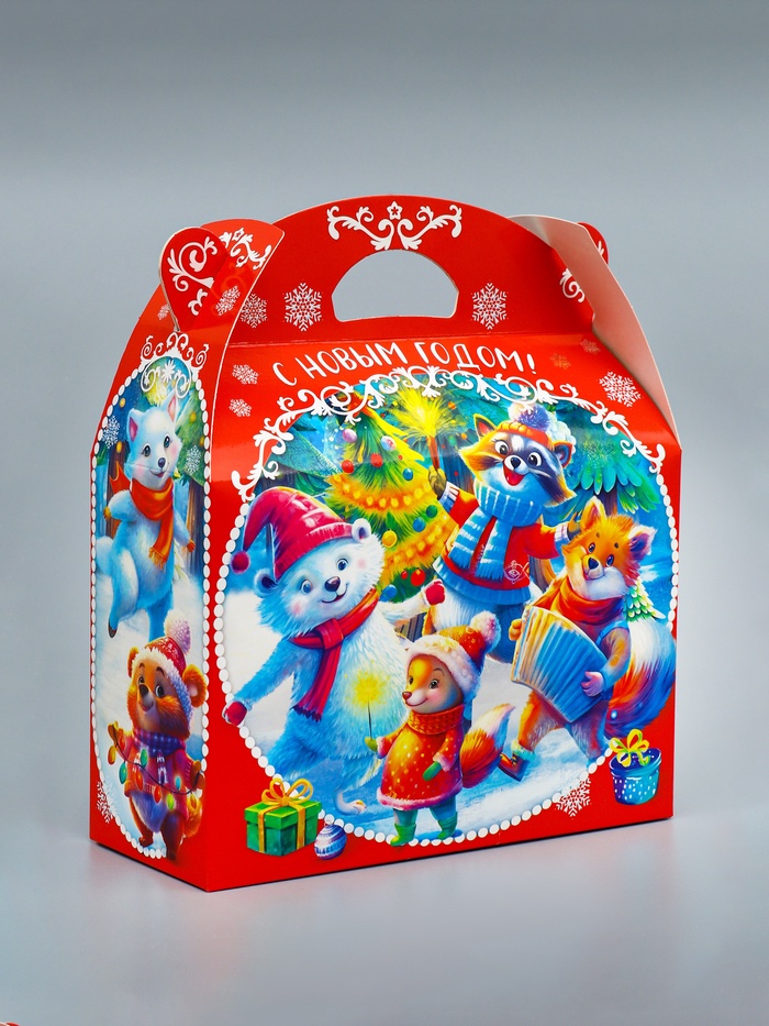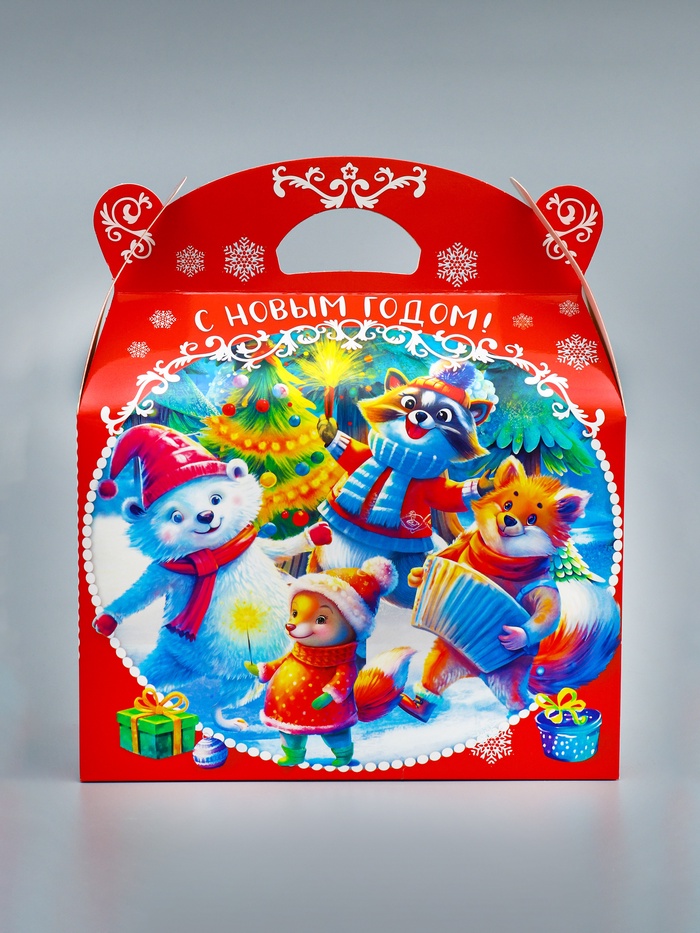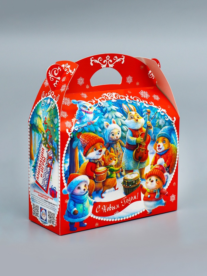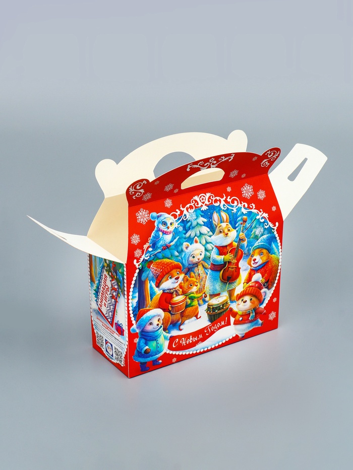 - Яркий праздничный дизайн: Красный цвет с традиционными зимними узорами и новогодними мотивами. Фигурные элементы делают упаковку особенно нарядной.