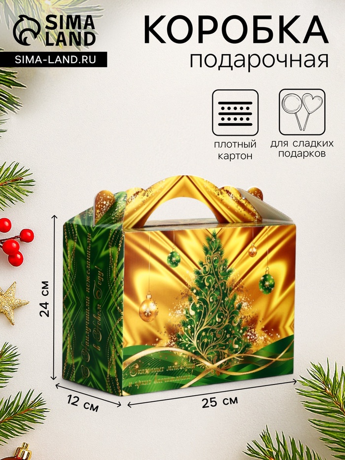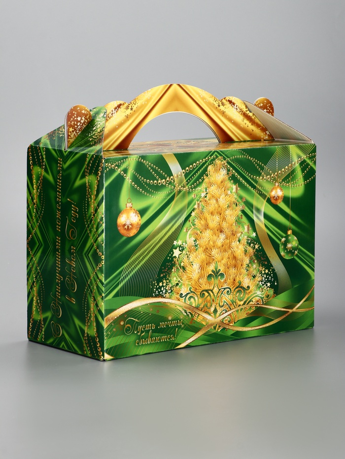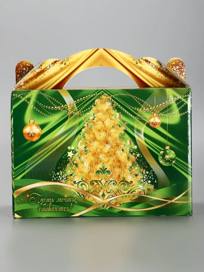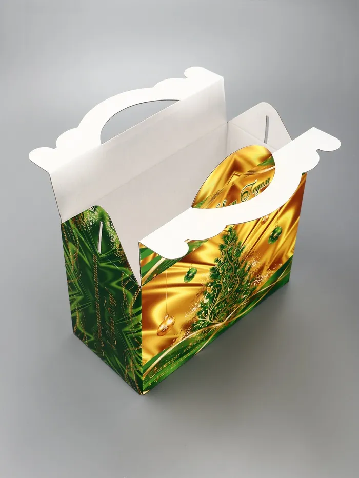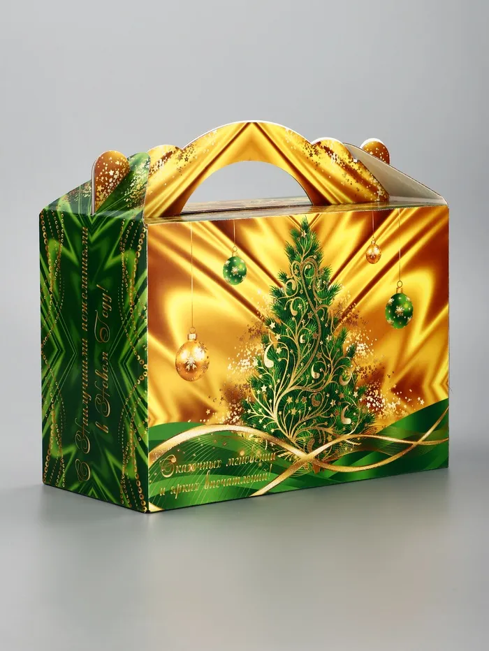 - Внесезонный дизайн: Классическое сочетание зелёного и золотого без привязки к символу года сохраняет актуальность в любой праздничный сезон. Коробку можно использовать несколько лет подряд.