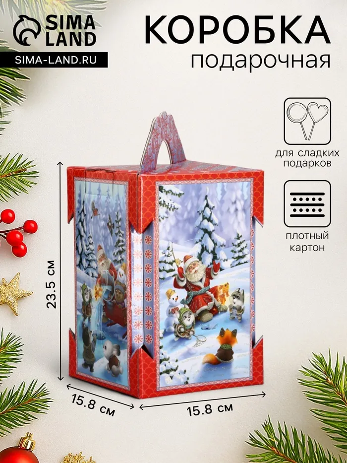 - Сбалансированный формат: Размеры 15.8×15.8×23.5 см подходят для наборов конфет, шоколадных плиток или небольших сувениров. Квадратное основание обеспечивает устойчивость.