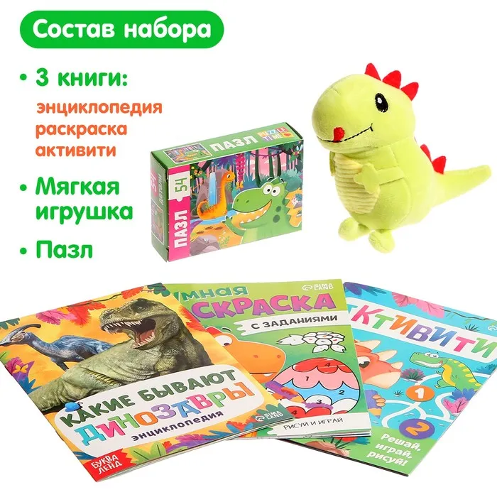 Подарочный набор 3в1 «Динозаврик Рекси», 3 книги, пазл, мягкая игрушка — Характеристики