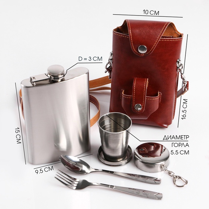 Фляжка мл: изготовлена из нержавеющей стали, сохранит ваши любимые напитки холодными в течение длительного времени.Ложка и вилка: практичные столовые приборы, которые всегда будут под рукой.Рюмка 100 мл: компактная и прочная, подходит для любых напитков.Чехол: стильный и удобный, защищает содержимое от повреждений и позволяет хранить все предметы вместе.Идеальное решение для путешествий, пикников, рыбалки и любых других активностей на природе. Этот подарочный набор станет отличным подарком для любителей приключений и активного отдыха.