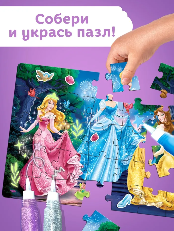 Набор сочетает в себе несколько видов активности: сборку пазлов, раскрашивание и декорирование. Светящиеся элементы добавляют волшебства, а возможность создать уникальные рисунки с помощью блёсток и красок развивает фантазию. Это не просто игра, а целый мир, где каждая девочка почувствует себя настоящей принцессой.