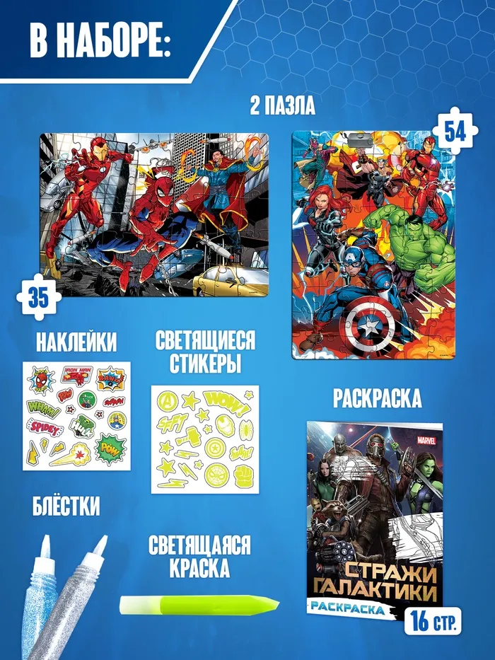 Подарочный набор 5 в 1 «Для мальчиков», пазлы, раскраска, наклейки, Мстители — Характеристики