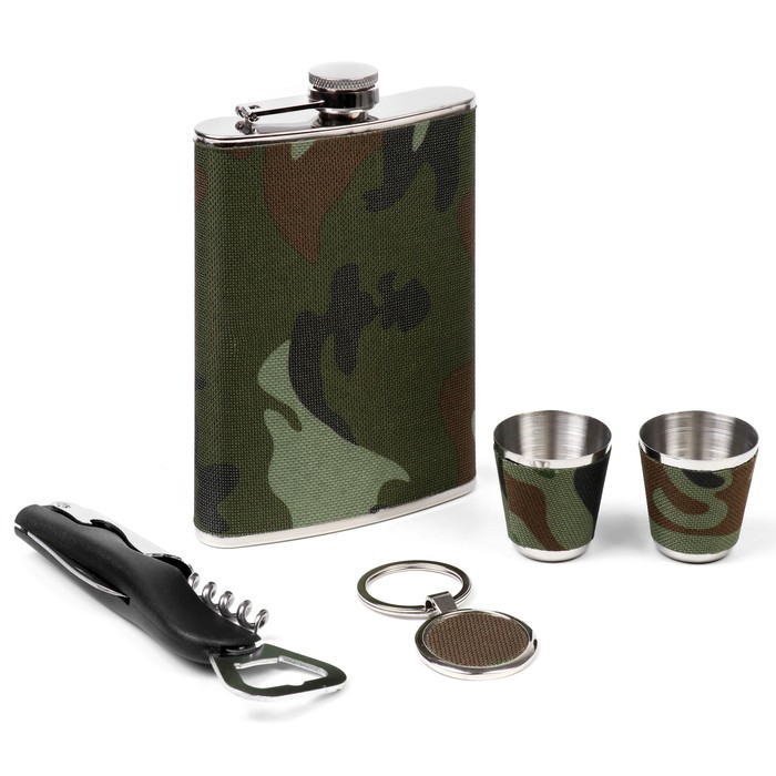 Подарочный набор 5 в 1 "Полевой": фляжка 270 мл, 2 рюмки,брелок, открывалка-штопор, 17 х 21.5 см 112 — Характеристики